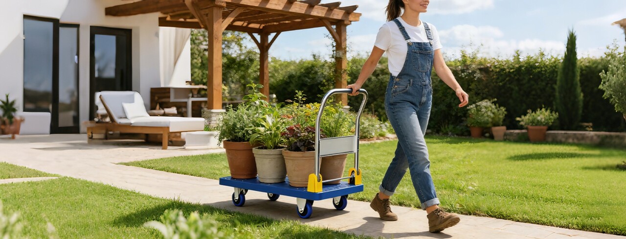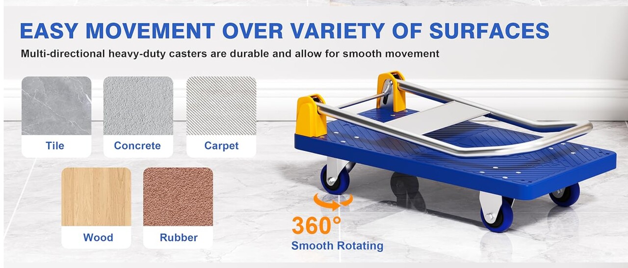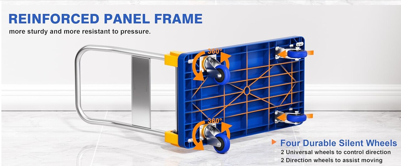 접이식 푸시 카트, 4륜 플랫폼 카트, 최대 200kg 하중 지지, 손잡이 포함, 360도 회전 가능 (파란색)