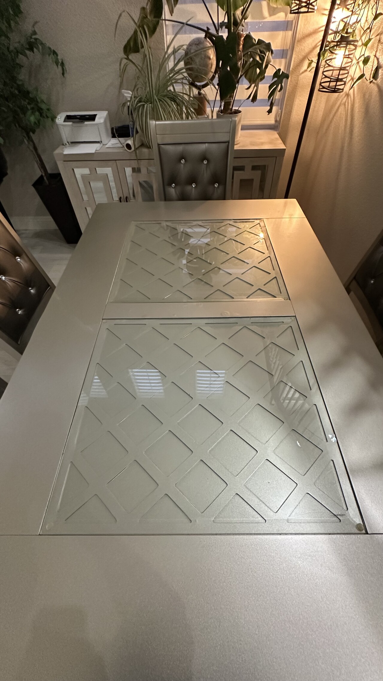 고급스러운 실버 글램 스타일 6인용 다이닝 세트입니다.