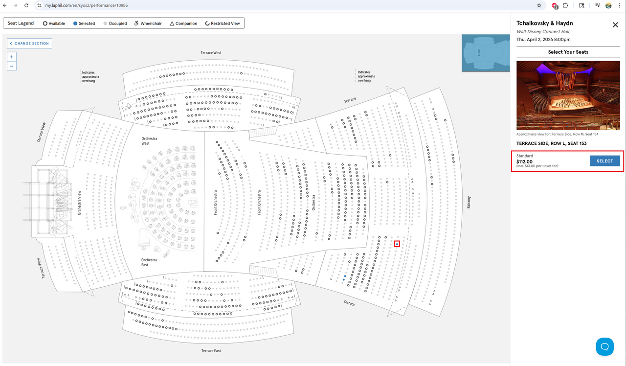 Terrace 섹션의 Row L 101-105 좌석표를 각 $90에 드립니다. 첨부된 화면캡쳐 사진들을 보시면 아시겠지만 L열은 LA Phil에서는 $112에 판매되고 있으며, 날짜가 가까워질수록 가격이 오르고 있습니다.