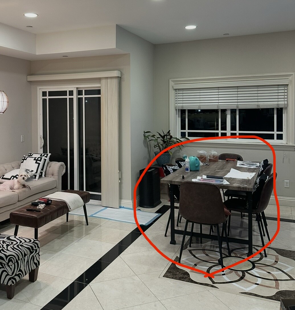 다이닝 테이블 필요하신 분 혹시 있을까 해서 올려봅니다. 철제 다리부분이 고급지고 튼튼해요. 위에 스크래치가 많이 나서 (상태 사진도 올립니다) 필요하신분은 픽업해서 가져가시면 그냥 드립니다.