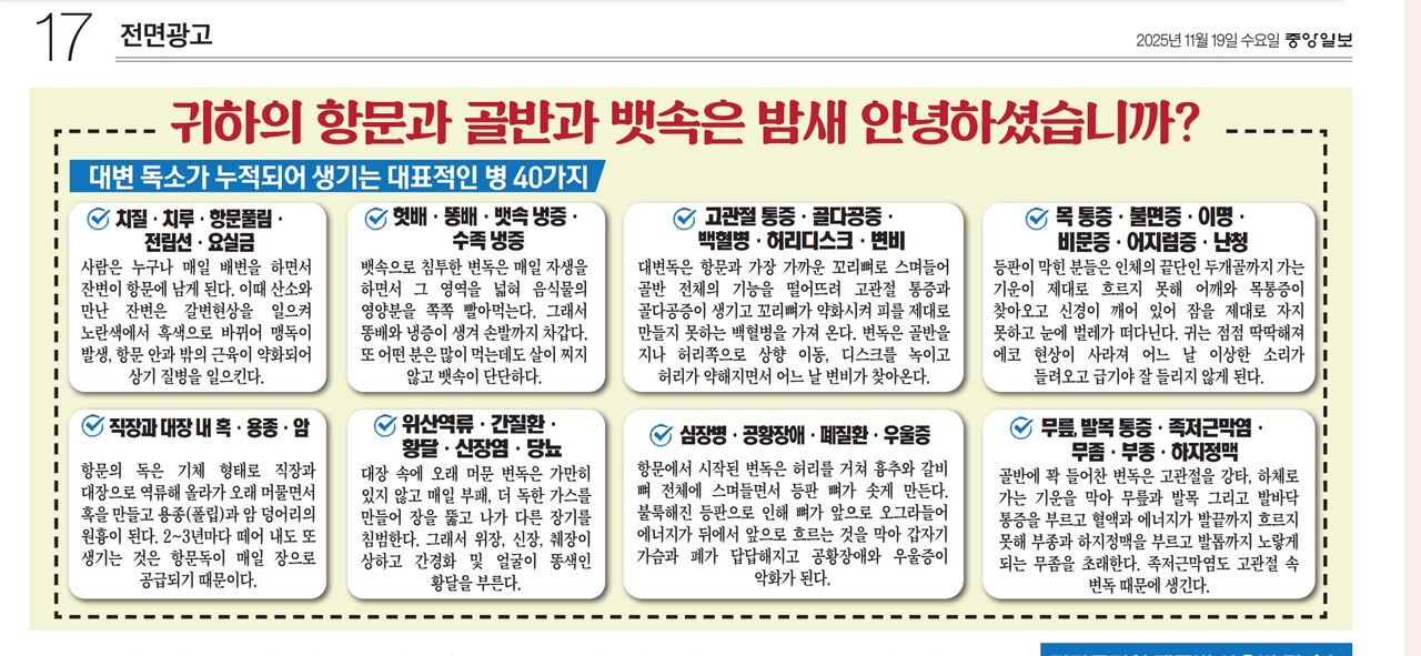 결국 치질, 치루를 예방하거나 치유가 되려면 매일 잔변이 남지 않게 해주고 이미 항문 안에 자리잡고 있는 것은 밖으로 내보내줘야 합니다.