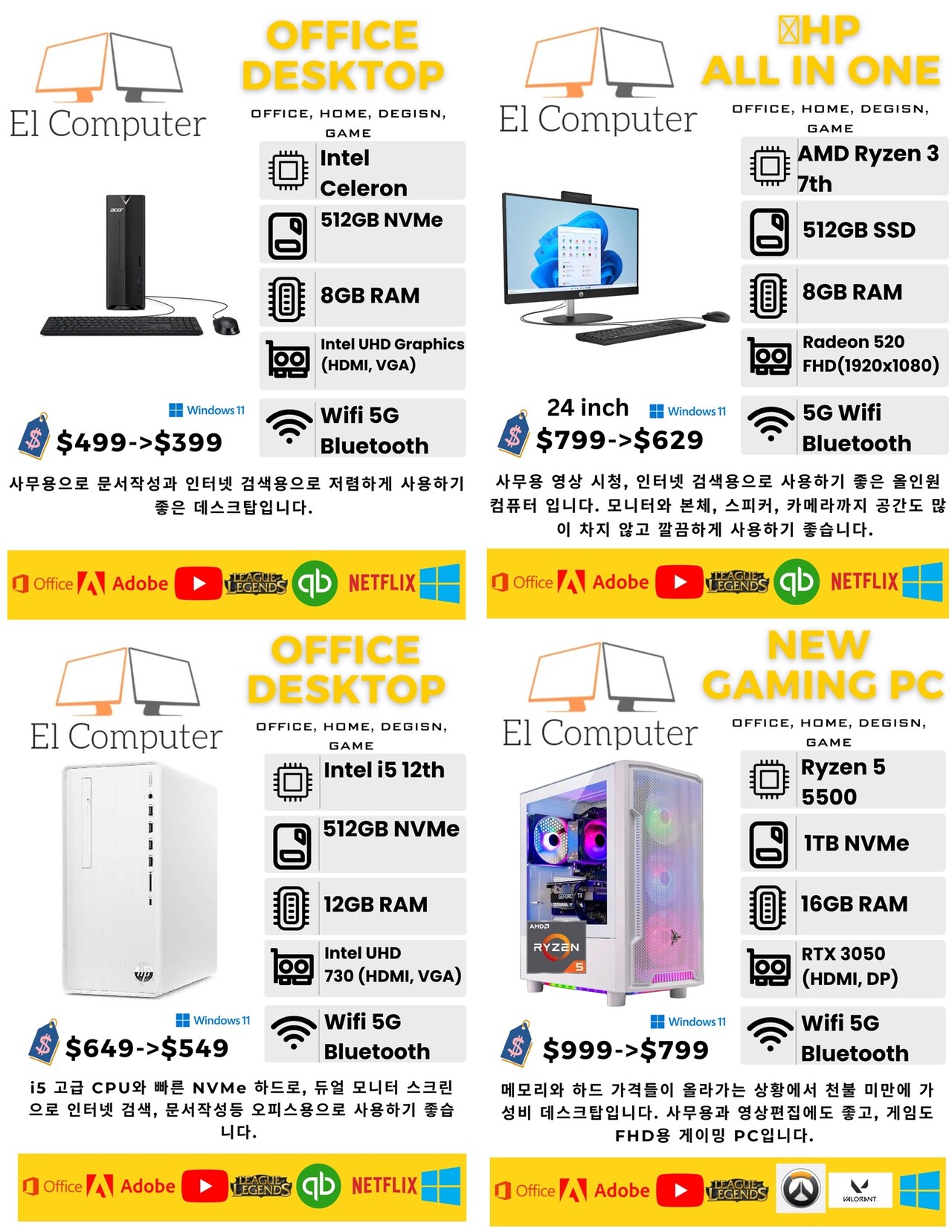 New 검퓨터는 물론, 중고 컴퓨터들(윈도우, 맥)도 좋은 컨디션에 프로그램 설치와 최적화되어서 최저가에 판매합니다. “비즈니스란에 컴엘258”로 검색하셔서 가격링크 비교해보세요.