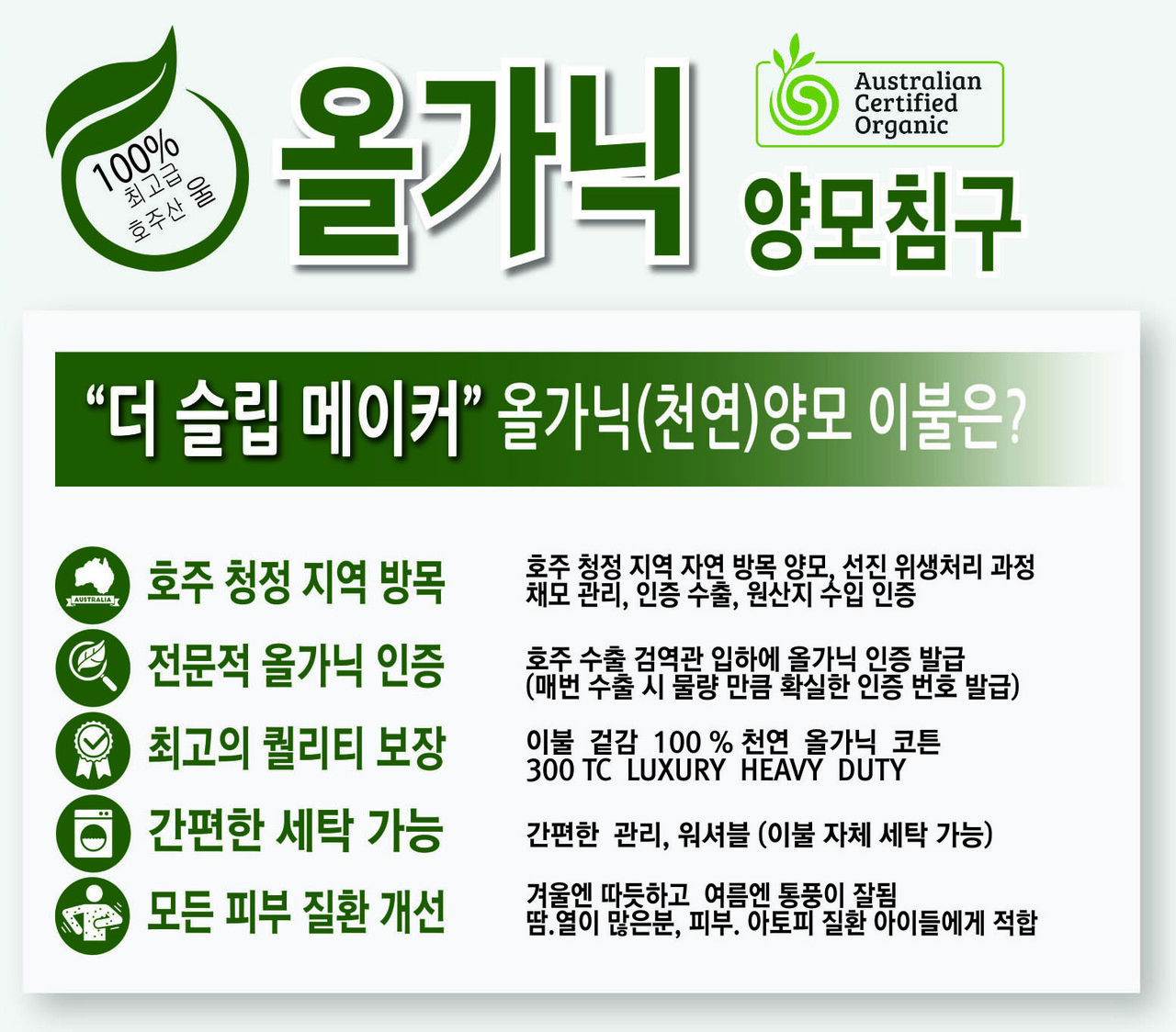 호주 천연 앙모이며 겉에 면은 300수 유기농 면입니다.