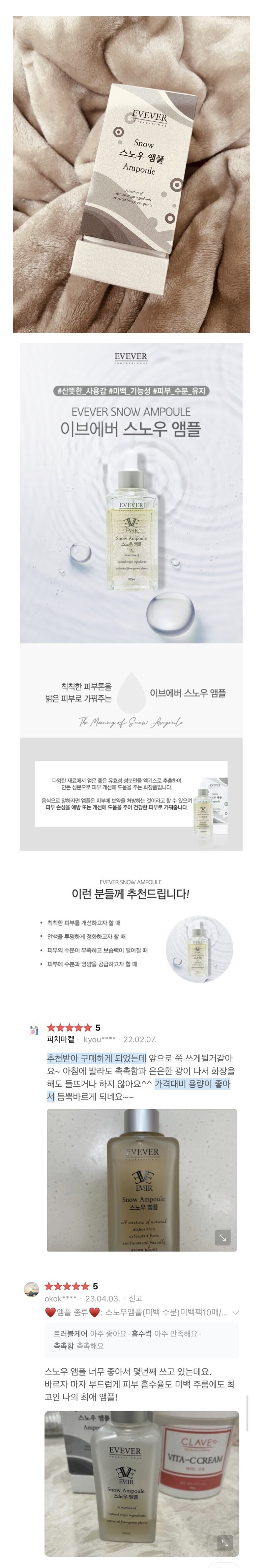 이브에버 스노우앰플은 끈적임없이 빠르게 흡수되는 미백앰플로 보습,진정효과 더불어 영양공급으로 인한 피부탄력까지 책임지는 만능 앰플로서 우리 피부를 환하게 밝혀줍니다!