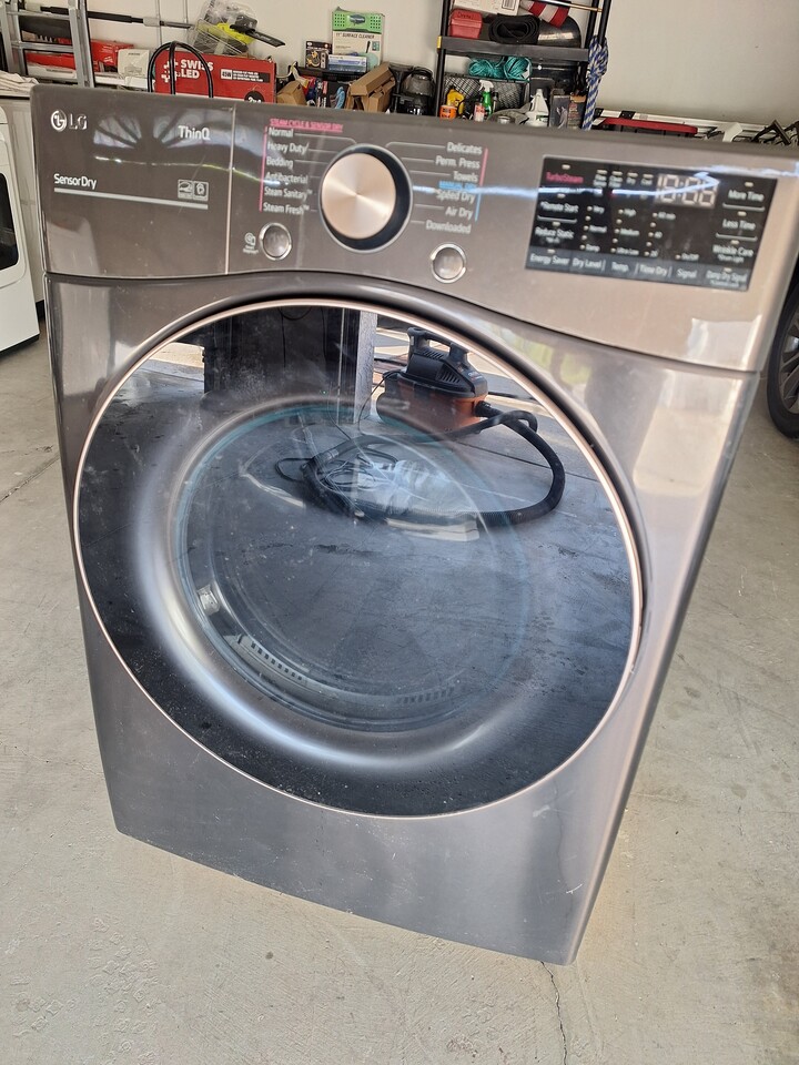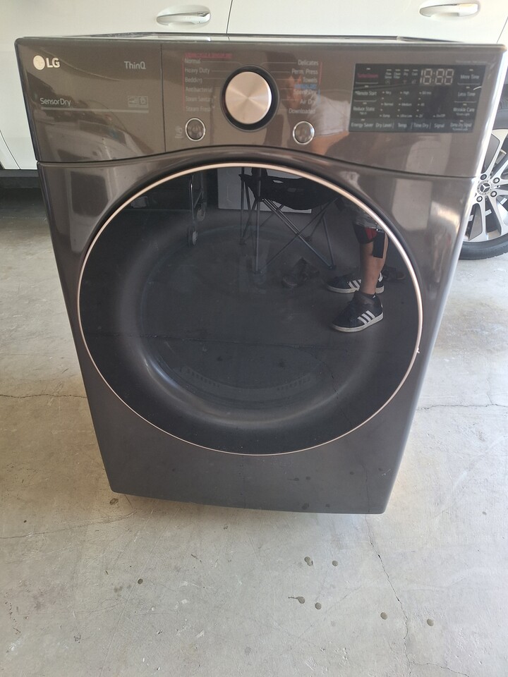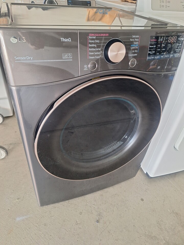 최신형 LG ThinQ SensorDry 건조기입니다. Wi-Fi 및 원격 시작(Remote Start)과 같은 스마트 기능을 탑재하고 있습니다. TurboSteam, Sensor Dry, Wrinkle Care 등 다양한 건조 코스를 제공합니다. 색상은 다크 그레이입니다.