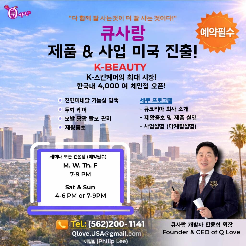 한국 #1, 세계 #1  헤어염색 및 두피케어 전문기업, 한국에서만 4,000개 넘는 점포를 운영하는 글로벌기업, 한국 큐사랑 K-Beauty  가 2026년 3월 29일(일요일) 세미나를 시작으로 여기 LA에 진출합니다.  이를 기념으로 한국 큐사랑에서 LA헤어염색, 두피케어 전문가들이 천연미네랄제품을 사용하여, 손상복구, 힐링, 염색(다양한 색상), 헤어케어, 두피케어 를 3월 30일 (월요일) 하루, 특별 저렴한 가격에 제공하기로 했습니다.  염색 $30 (최소 $80 가치), 두피케어 $30 (최소 $100가치).  선착순 약 20 명 정도만 예약받습니다. 원하시는 분은 저에게 연락(문자로 먼저)하여 스케줄 예약하십시요.  그리고, 이날 집에서 염색및 두피케어 할수있는 천연미네랄 염색약, 샴푸, 트리트먼트등 큐사랑 K-Beauty미네랄 제품도 판매합니다.  장소: 레인보우 미용실(Rainbow Hair Touch), 주소: 3400 W. 8th  St.  Los Angeles, CA 90005