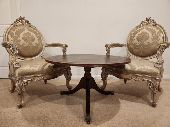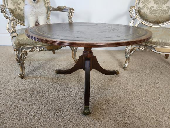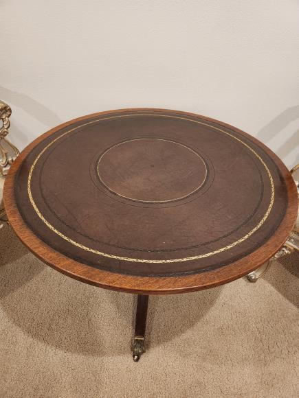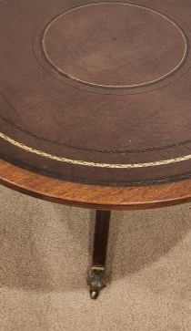 다리 밑부분이 바퀴로 되어있어 멋스럽고, 가운데 부분은 가죽으로 되어있어 장식물 올려놓으시면 분위기가 고급진 탁자입니다.