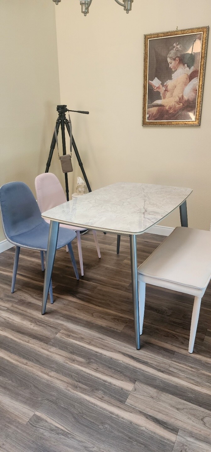 15. 4인용 세라믹 식탁 세트 (테이블, 의자 2, 벤치 1):$300