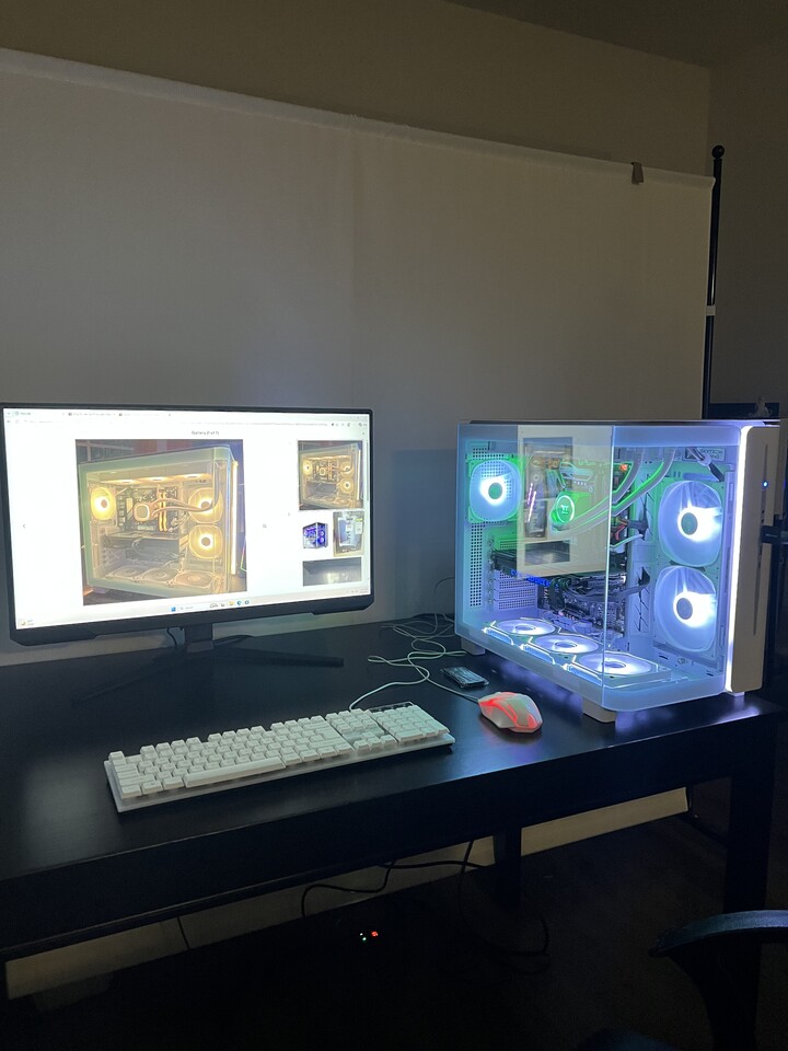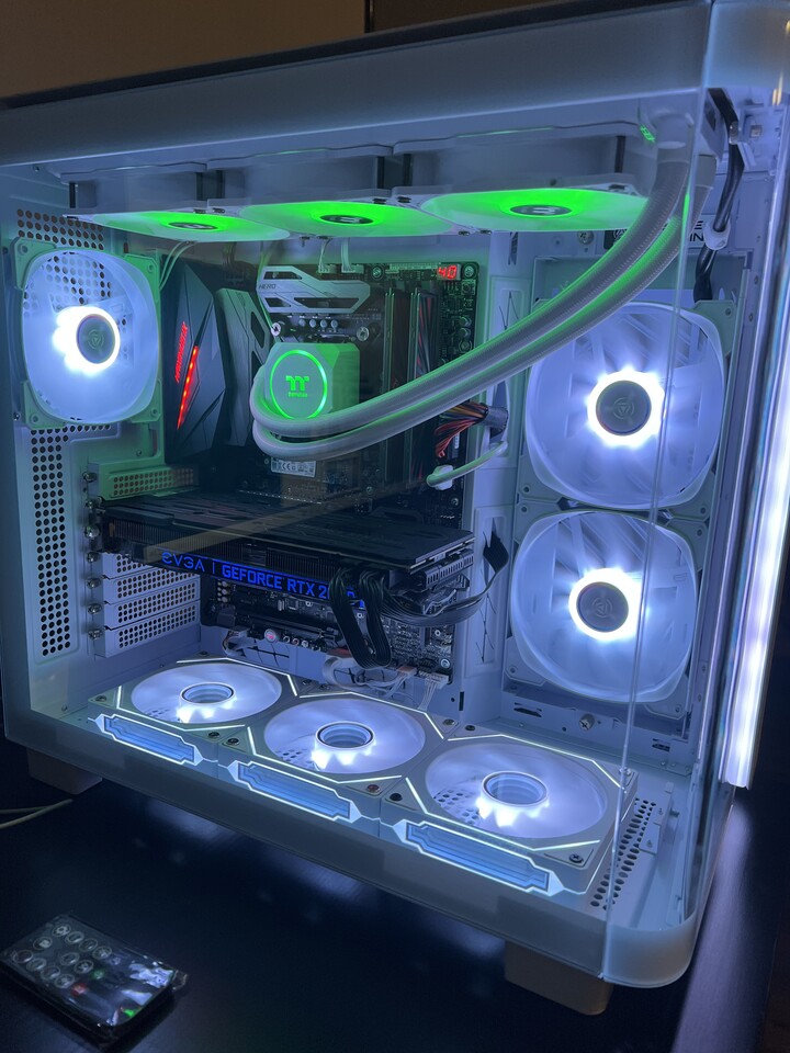 어항PC의대표모델 king95 PRO입니다 새제품케이스에 기존에쓰던게이밍pc를 옮겻습니다 사양은 asus masximus ix hero motherboard intel i7-7700K thermaltake 360 RGB liquid cooler 16gb ram 512gb SSD RTX2080 corsair cx750 입니다 $750불에팝니다