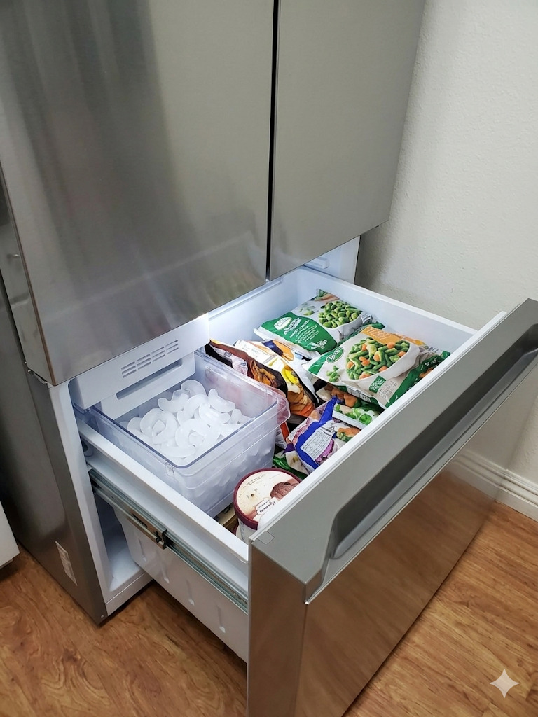 상단에는 양문형 냉장실, 하단에는 서랍형 냉동실이 있어 수납이 매우 편리합니다.
