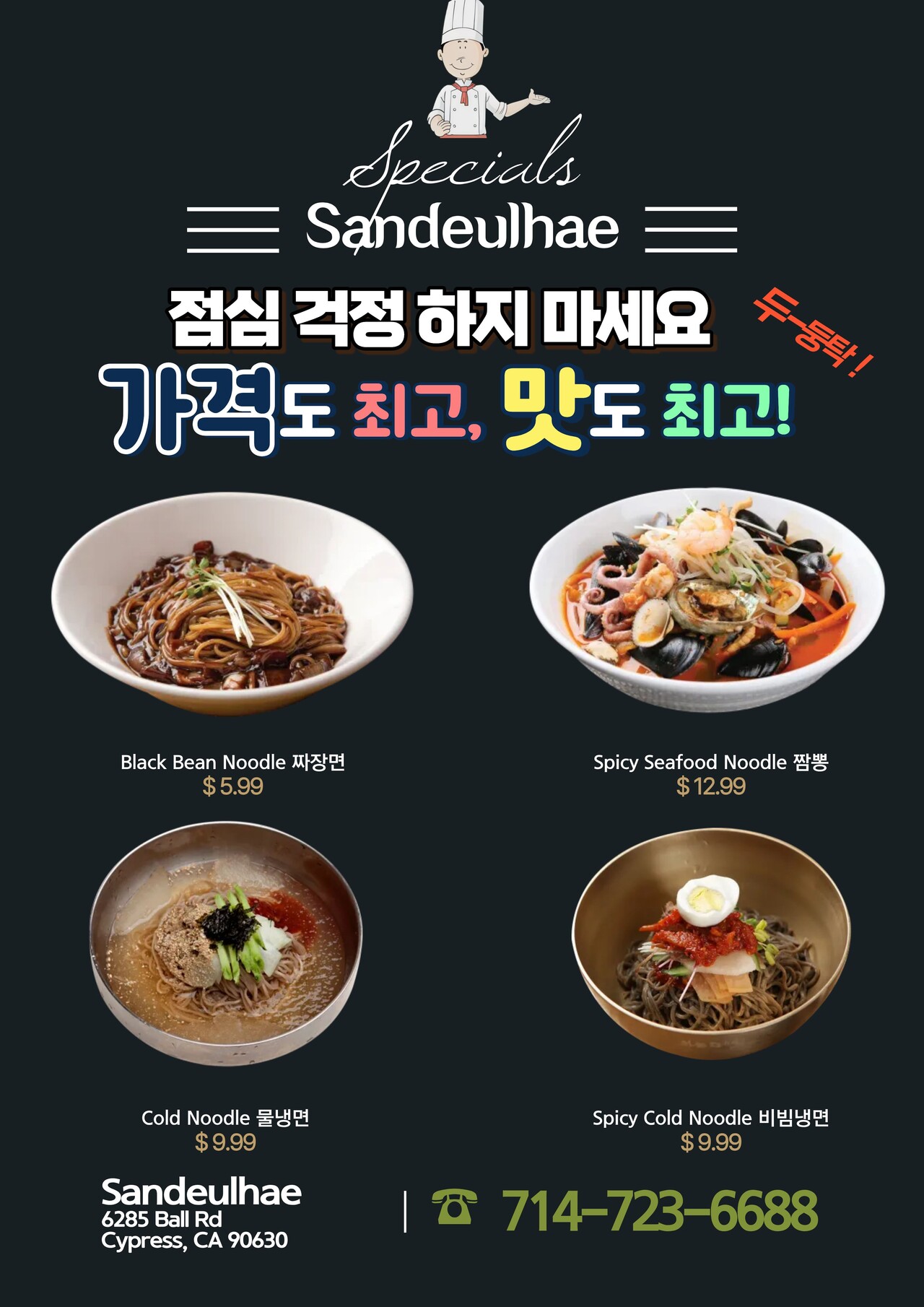 짜장 $ 5.99. 냉면 $ 9.99