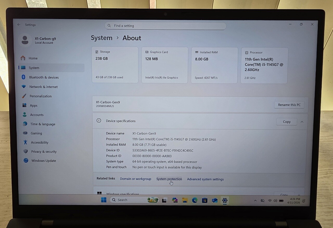 - 인텔 Core i5-1145G7 CPU, 14인치 FHD (1920x1200) 100% sRGB 스크린, 8GB 메모리, 256GB M.2 SSD, 인텔 wifi 6 AX201 & bluetooth, 윈도우 11 Pro, 레노버 USB type-c AC adapter 포함