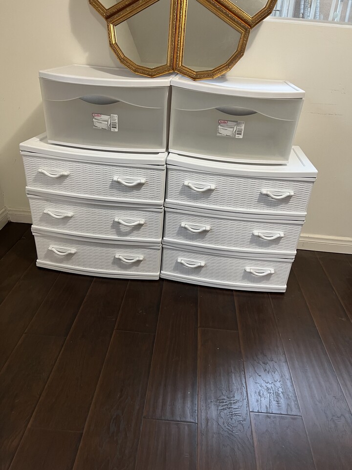 플라스틱 서랍장들. 벽시계. 차단스. 유리컵들등 등