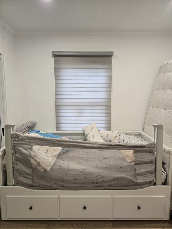 멀티 기능 침대입니다. 서랍 3개 포함되어 있어 수납공간도 넉넉합니다. 어린아이 낙상 방지 가드레일도 함께 드리니 어린 자녀 있는 가정에 특히 추천드리며 더 자세한 제품사양은 아래 링크 참고하세요