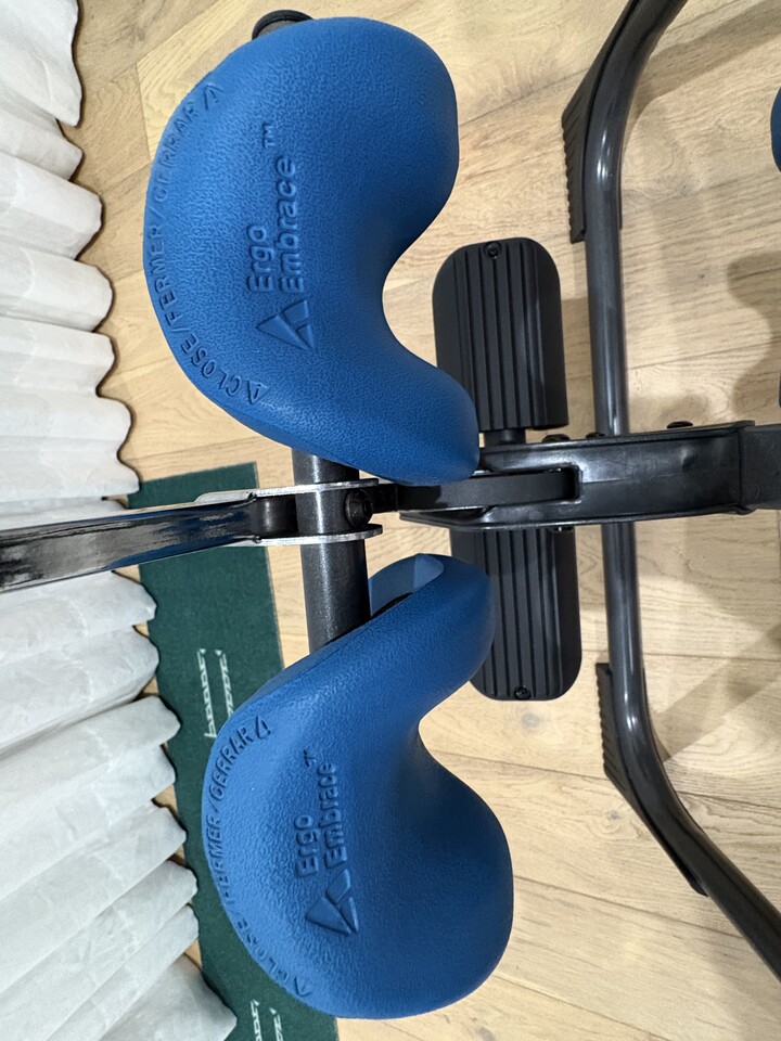 사진에 보듯이 파란색 'Ergo- Embrace' - 발목지지대와 등판의 헤드레스트가 다 갖추어져 있는 * 고급형 꺼꾸리 입니다.