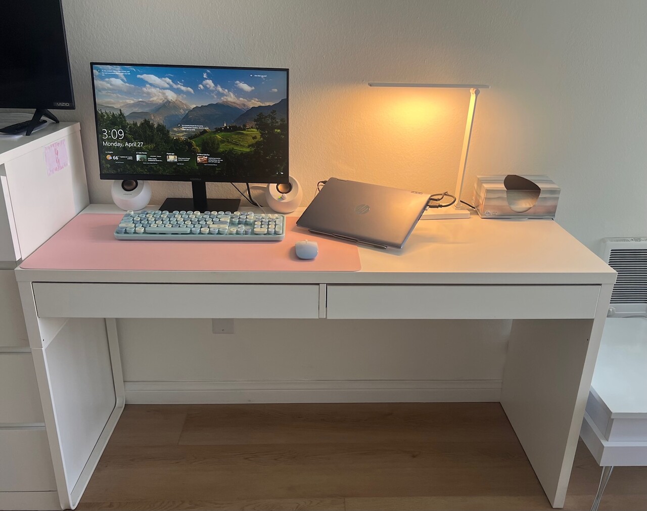 가로로 긴 화이트 데스크입니다. 아이키아 제품