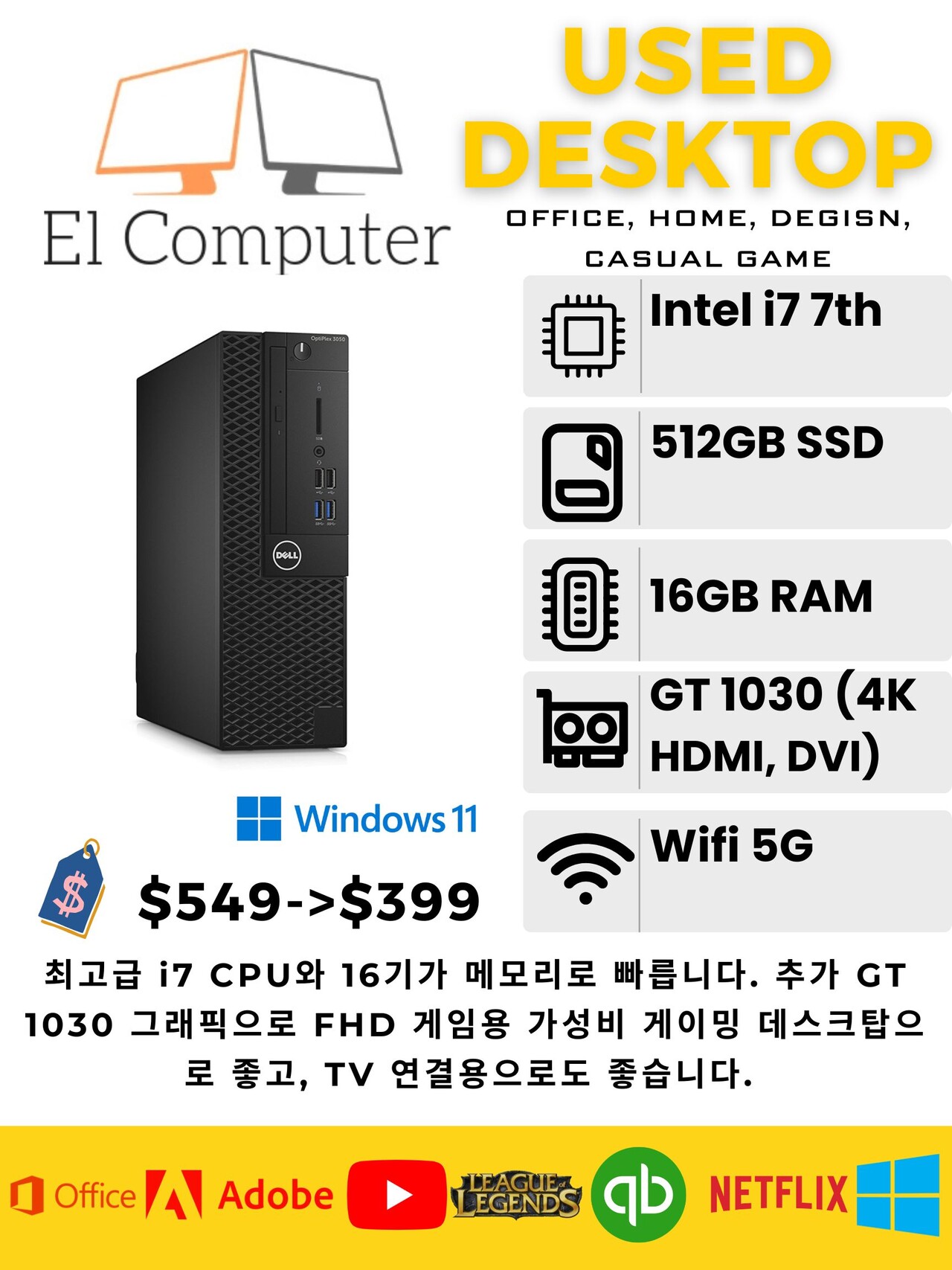 최고급 i7 CPU와 16기가 메모리로 빠릅니다. 추가 GT 1030 그래픽으로 FHD 게임용 가성비 게이밍 데스크탑으로 좋고, TV 연결용으로도 좋습니다.