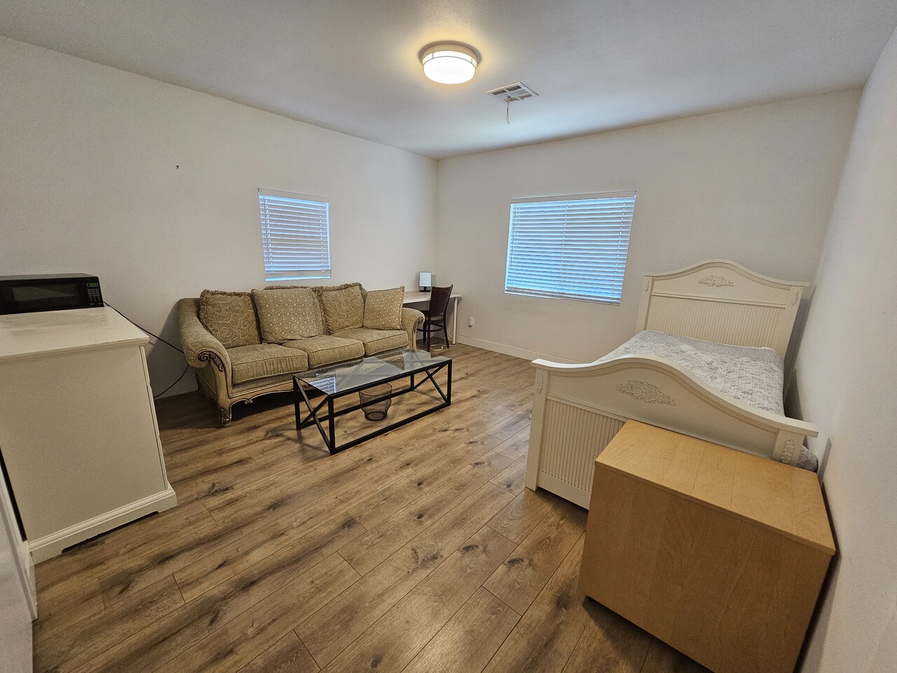 > 침대. 책상.냉장고. 전자렌지에 구비되어 있음.