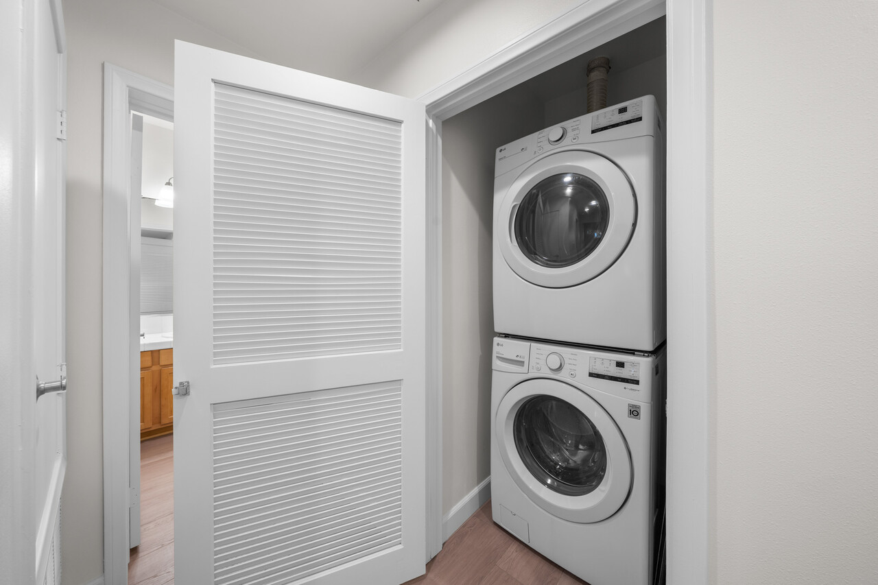The private master suite includes a full bathroom and two closets, including a large walk-in. Enjoy a private balcony with tree views, central A/C, and secured two gated parking spaces with elevator access to the entry level.