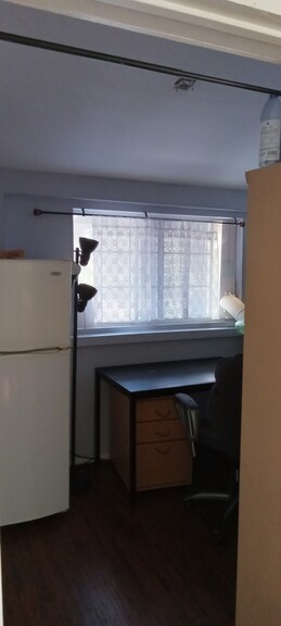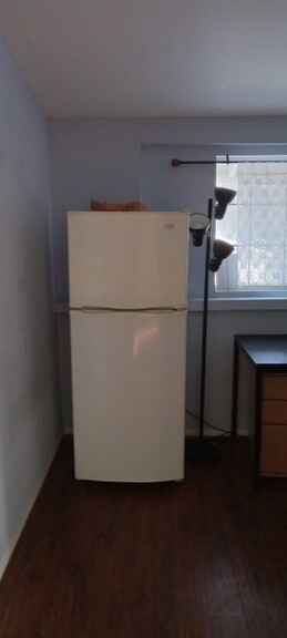 침대, 냉장고, 마이크로오븐, 탁자, 옷서랍, 옷장,