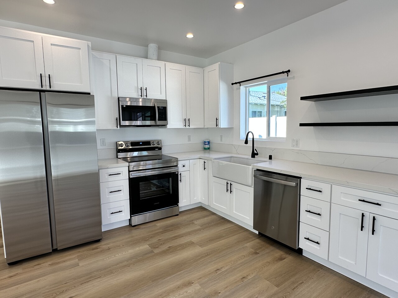 - 주방은 쿼츠 조리대, 욕실은 타일 (Quartz countertops in kitchen and tiles in baths)