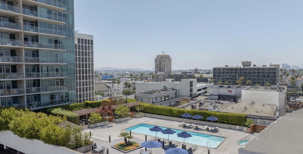 24-hour concierge, pool and spa with cabanas, fitness center with views, BBQ areas, dog run, business center, guest parking.