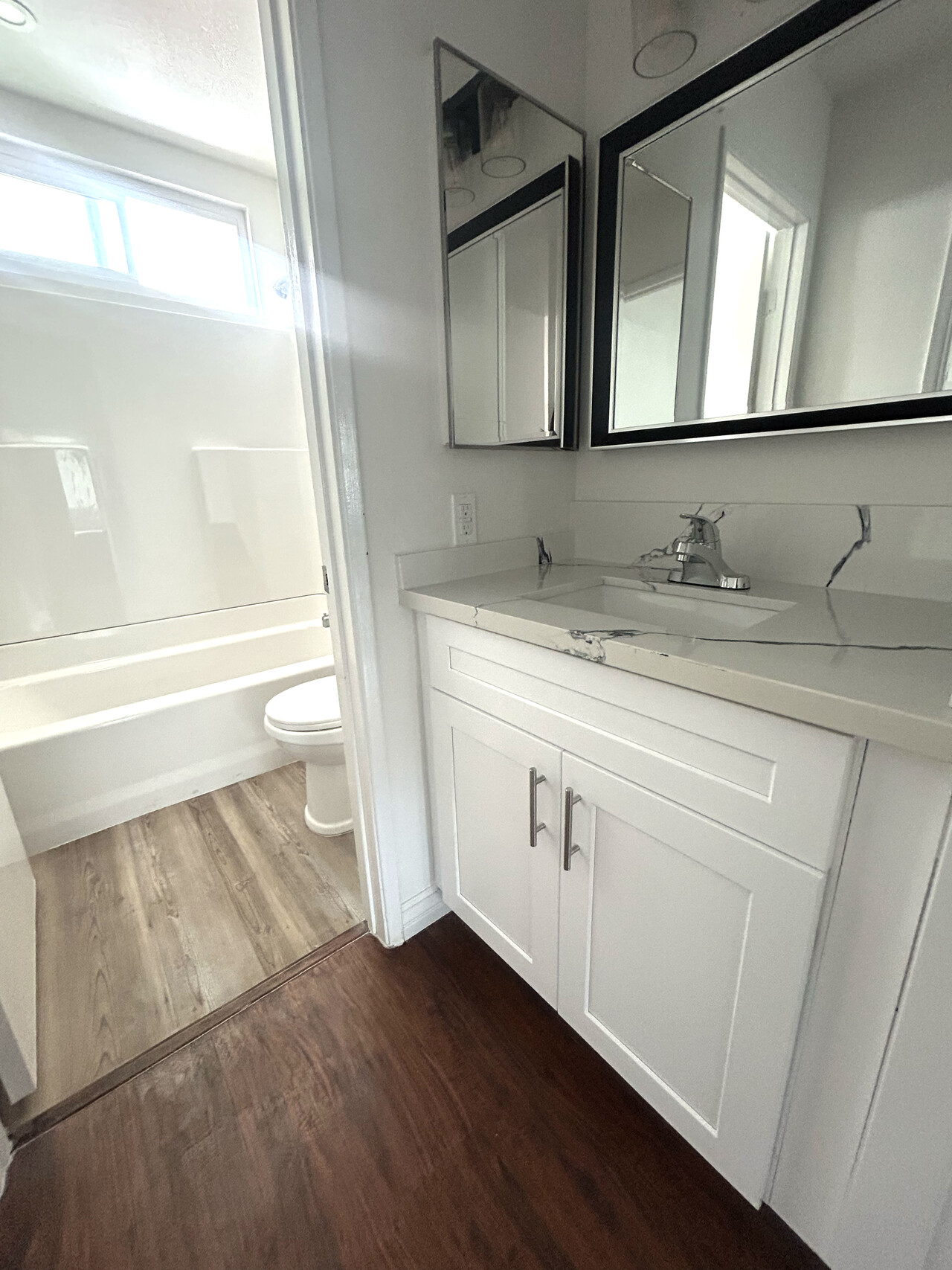New paint, New kitchen cabinets, New bathtub and hardwood floor.