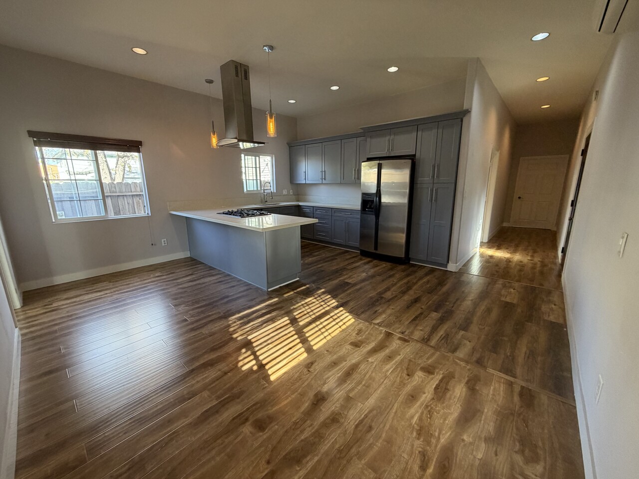 우드톤 바닥과 높은 천장, 매립 조명으로 공간이 넓고 세련된 느낌을 줍니다.