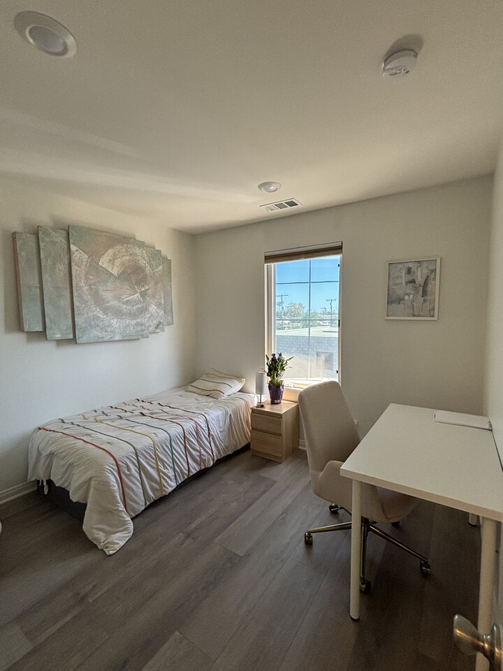 - 기본 가구 완비: 침대 프레임, 매트리스, 책상, 의자, 책장. 방 인테리어 예뻐요.