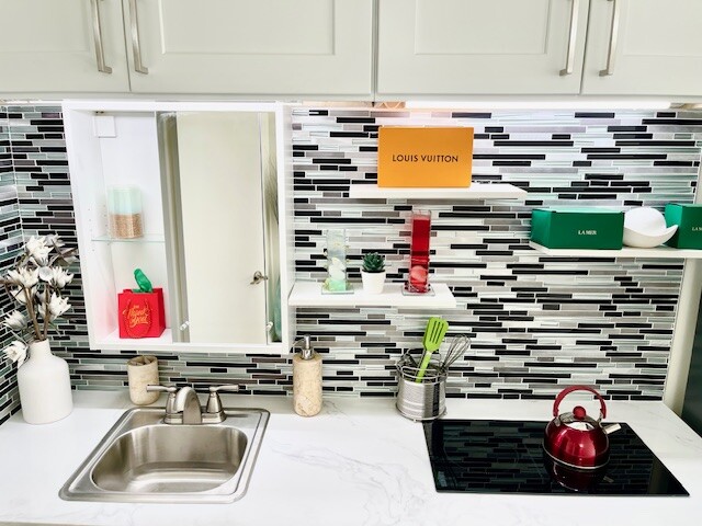 - Mini Kitchen: 부엌에 Sink 와 , COOKTOP (Stove), Microwave, 냉장고 있습니다.