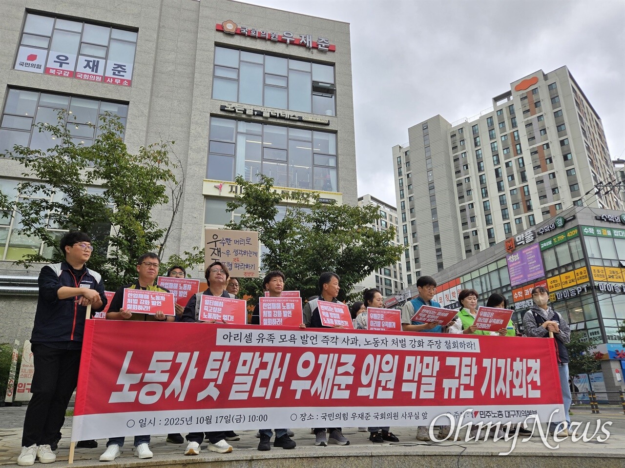 민주노총 대구본부를 비롯한 대구지역 시민단체는 17일 우재준 의원 지역 사무실 앞에서 막말 규탄 기자회견을 열고 "아리셀 유족에 대한 모욕 발언을 즉각 사과하고 노동자 처벌 강화 주장을 철회하라"고 촉구했다.