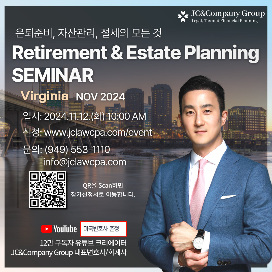 2024년 11월 12일 화요일, JC&Company의 존청 변호사가 버지니아 교민들이 꼭 알아둬야 할 은퇴, 자산관리, 절세, 투자전략 세미나를 개최합니다.