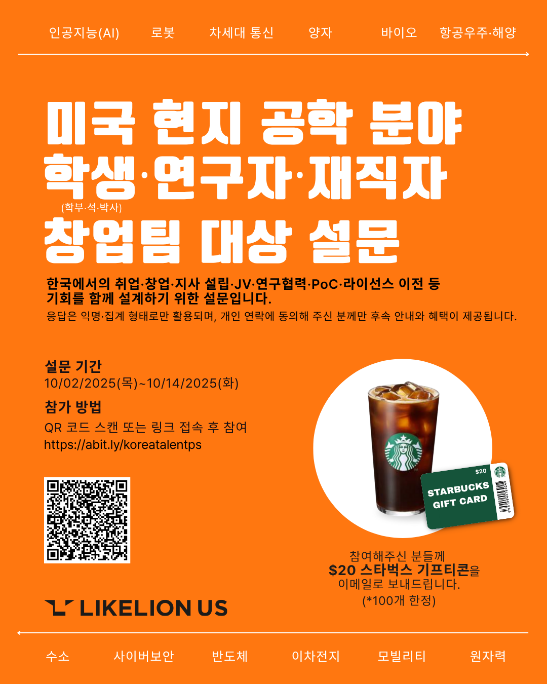 - 혜택: 정성껏 답변을 주시고 개인 연락에 동의하신 분께 $20 스타벅스 기프티콘을 이메일로 보내드립니다.(*100개 한정)