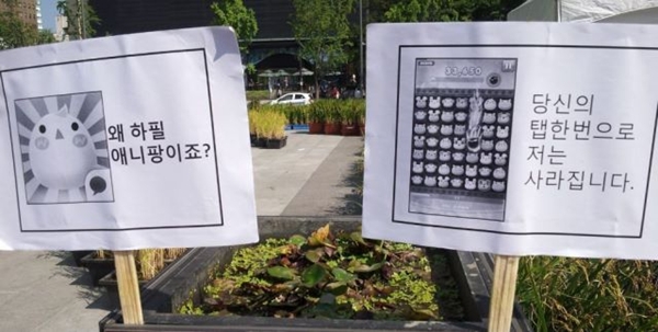 저는 사라집니다"라고 적혀진 푯말이 화단에 꽂혀 있는 것을 확인할 수 있다. 애니팡은 특정 동물을 3마리 이상 일렬로 배열하면 점수를 얻을 수 있는 게임이다.