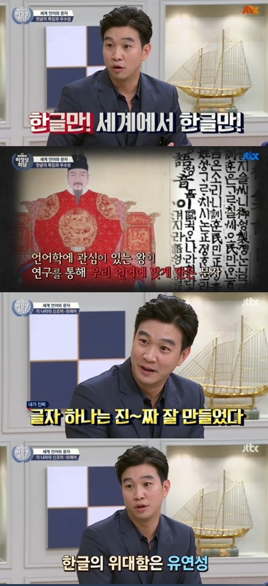조승연은 "한글은 백성들을 위한 것이다. 한글 창제 이후 500년이 지났다. 우리나라도 많이 바뀌고, 핸드폰·컴퓨터도 발명됐다. 시대가 변했음에도 아직도 한글로 표기가 가능하다는 걸 보면 '내가 글자 하나는 진짜 잘 만들었다'고 하시지 않을까 생각한다. 한글의 위대함은 그 유연성에 있다. 사람들이 말하는 걸 그대로 적을 수 있다는 건 아무리 변해도 끄떡없을 것"이라고 했다.