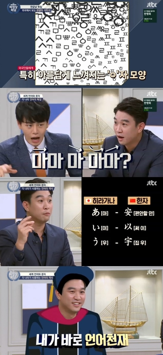 9일 방송된 JTBC '비정상회담'에서는 한글날을 맞아 세계의 다양한 언어와 문자에 관해 이야기하는 시간을 가졌다. 언어 전문가 조승연 작가가 함께했다.