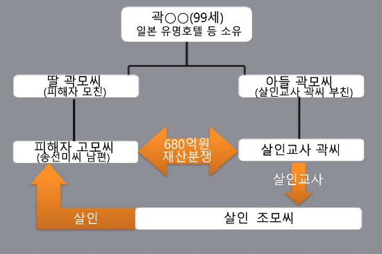 검찰에 따르면, 곽씨는 지난 7월 재일교포 재력가인 친할아버지 소유의 680억원대 부동산을 놓고 사촌형 고모(44)씨와 분쟁이 이어지자 그를 살해할 계획을 세운다. 피해자 고씨가 배우 송씨의 남편이다.