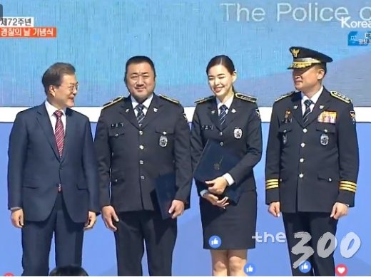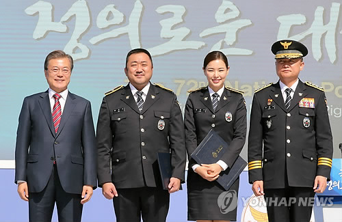 배재만 기자 = 문재인 대통령이 20일 오전 서울 광화문에서 열린 제72주년 경찰의날 기념식에서 명예경찰관으로 위촉된 배우 마동석과 이하늬와 기념촬영하고 있다. 오른쪽은 이철성 경찰청장. 2017.10.20