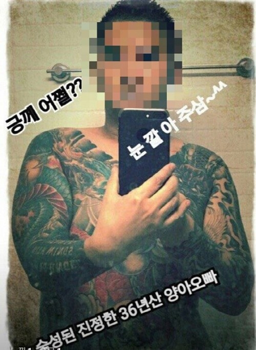 뿐만 아니라 그의 계정에는 온몸에 문신을 한 사진도 게재돼 있다. 사진에는 '숙성된 진정한 36년생 양아오빠'란 자기소개글귀도 적혀있어 충격을 안겼다.