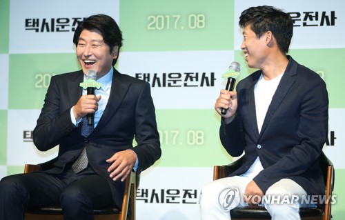 (서울=연합뉴스) 류효림 기자 = 배우 송강호(왼쪽)와 유해진이 20일 오전 서울 강남구 신사동 압구정CGV에서 열린 영화 '택시운전사' 제작발표회에서 환하게 웃고 있다. 2017.6.20 ryousanta@yna.co.kr