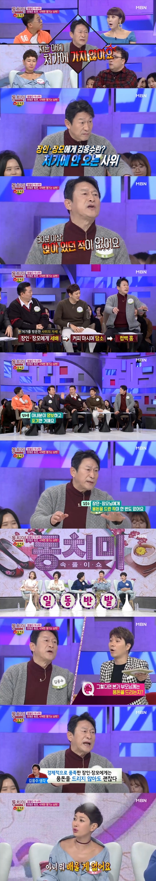 이에 개그맨 임하룡은 "이건 사모님이 양보를 하고 포기를 한 거다"고 지적했고, 김응수는 "맞다. 나는 그동안 장인, 장모님에게 용돈을 드린 적이 한 번도 없다. 물론 우리 집에는 드린다. 장인, 장모님은 용돈을 안 드려도 풍족하다"고 폭탄발언을 이어갔다. 김응수의 말에 배우 변정수는 "뭐 배울 게 없다"며 한숨을 내쉬었다.