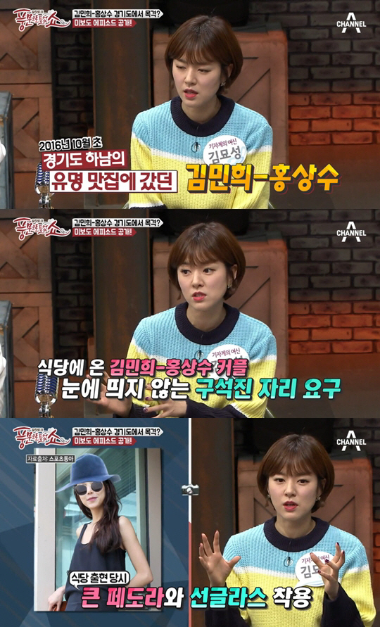 이날 한 기자는 "김민희-홍상수가 불륜 스캔들 이후 한 식당에 함께 모습을 드러낸 적이 있다"고 전했다. 기자에 따르면 두 사람은 지난해 10월 초 경기도 하남에 있는 유명 맛집을 찾았고, 다른 사람을 의식하지는 않았지만 구석진 자리를 요구했다는 것.
