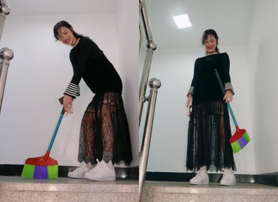 공개된 사진에서 설리는 검정색 시스루 레이스 원피스를 입고 포즈를 취했다. 빗자루를 들고서 계단을 청소하는 듯한 모습이 눈에 띈다.