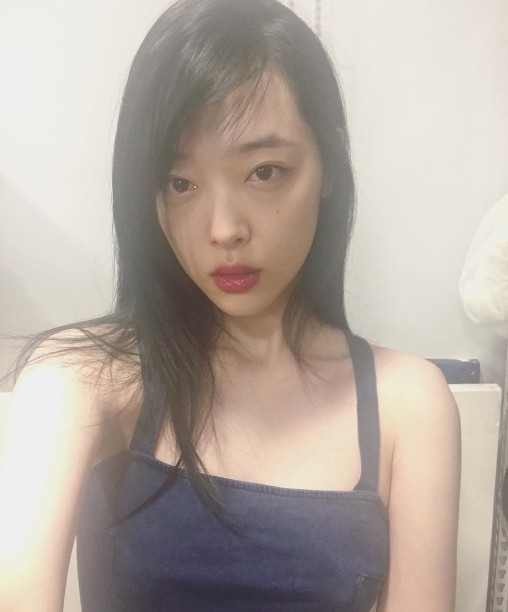 6일 오후 설리는 자신의 인스타그램에 사진을 게재했다. 사진 속 설리는 네이비색 아찔한 민소매 의상을 입고 매혹적인 시선으로 카메라를 응시하고 있다.