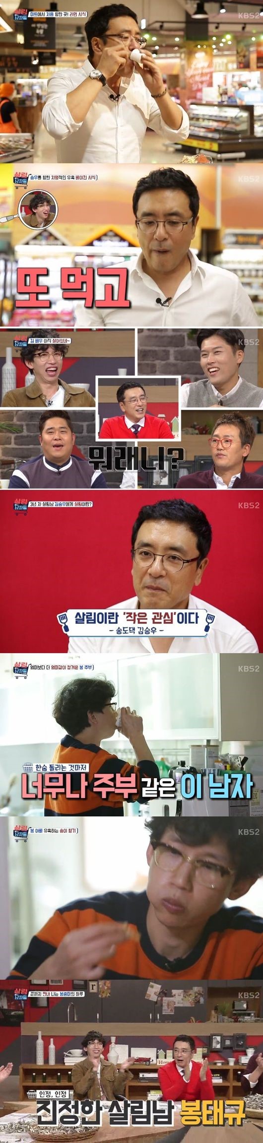 8일 방송된 KBS '살림하는 남자들'에서는 배우 김승우, 봉태규, 배드민턴 해설위원 하태권의 살림하는 모습이 공개됐다.