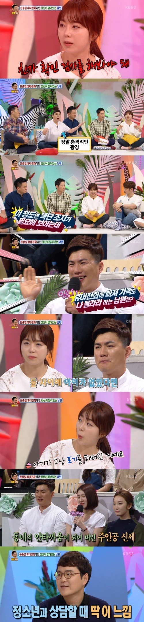 사연의 주인공은 "남편이 하루종일 휴대폰으로 인터넷 방송을 본다"며 입을 열었다. 주인공은 "한 번은 아기를 보는데 한 손에는 휴대폰을 한 손에는 아기에게 우유를 주고 있었다 아기 입에서 우유가 줄줄 세고 있더라"며 놀라운 일화를 밝혀 스튜디오를 경악케했다.