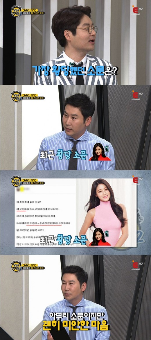 신동엽은 "저는 뭐 사실 크게 소문에 휘말린 적이 없었는데 최근 황당했던 소문이 있었다"면서 "증권가 정보지에 AOA 설현에게 내가 차를 사줬다는 내용이 담겼었다"고 말했다.