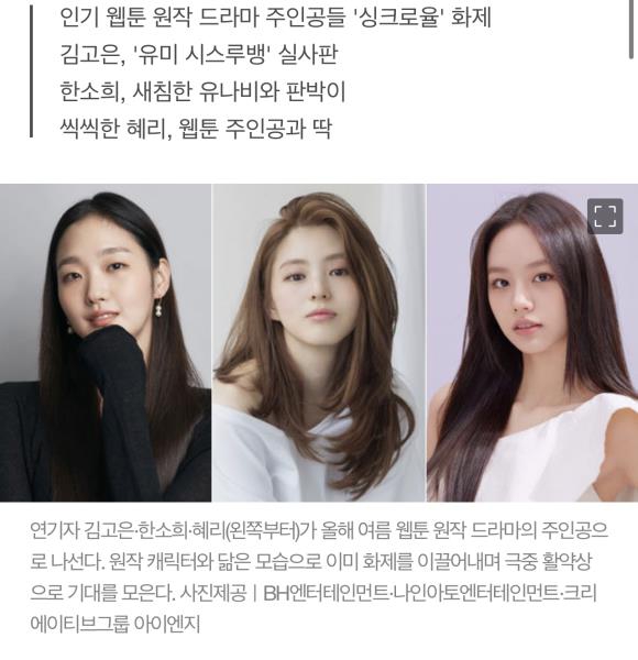 만찢녀’(만화를 찢고 나온 듯한 여자)들의 대결이 펼쳐진다. 연기자 김고은·한소희·혜리가 각각 인기 웹툰을 원작으로 한 드라마 주연으로 시청자 앞에 선다. 웹툰 속 캐릭터의 헤어스타일과 표정, 몸짓 등을 빼닮은 ‘싱크로율’로 원작 팬 사이에서도 화제를 모으고 있다.