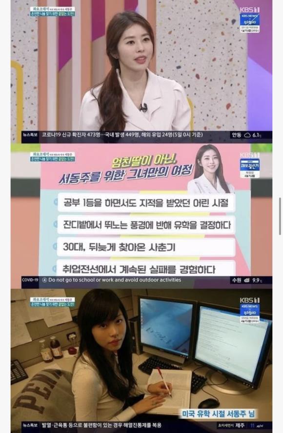 서동주는 공부 1등을 하면서도 지적을 받았다. 서동주는 “항상 1등은 아니지만 상위권이었다. 지적을 많이 받은 이유는 내가 산만하기 때문이다. 10분 공부하면 10분 딴짓하고 했다. 그런데 그렇게 오래 앉아있었기에 상위권에 있었던 것 같다. 미술 전공하다가 수학을 하고, 법을 넘어가느냐고 하는데, 다 같이 하고 있었고, 당시에 그 모습이 부각됐었던 것”이라고 설명했다.