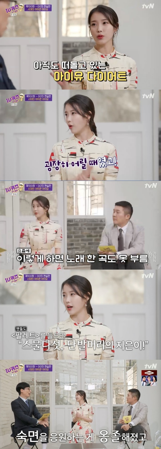 아이유는 "짚어줘서 고맙다"고 말한 뒤 "아직까지 인터넷에서 떠돈다. 이때는 나도 21~22살, 어릴 때였고 3일 정도 아주 단기간에 했다. 요즘은 이렇게 하면 노래 한 곡도 못 부른다. 이제는 절대 이렇게 안 한다"고 당부했다.